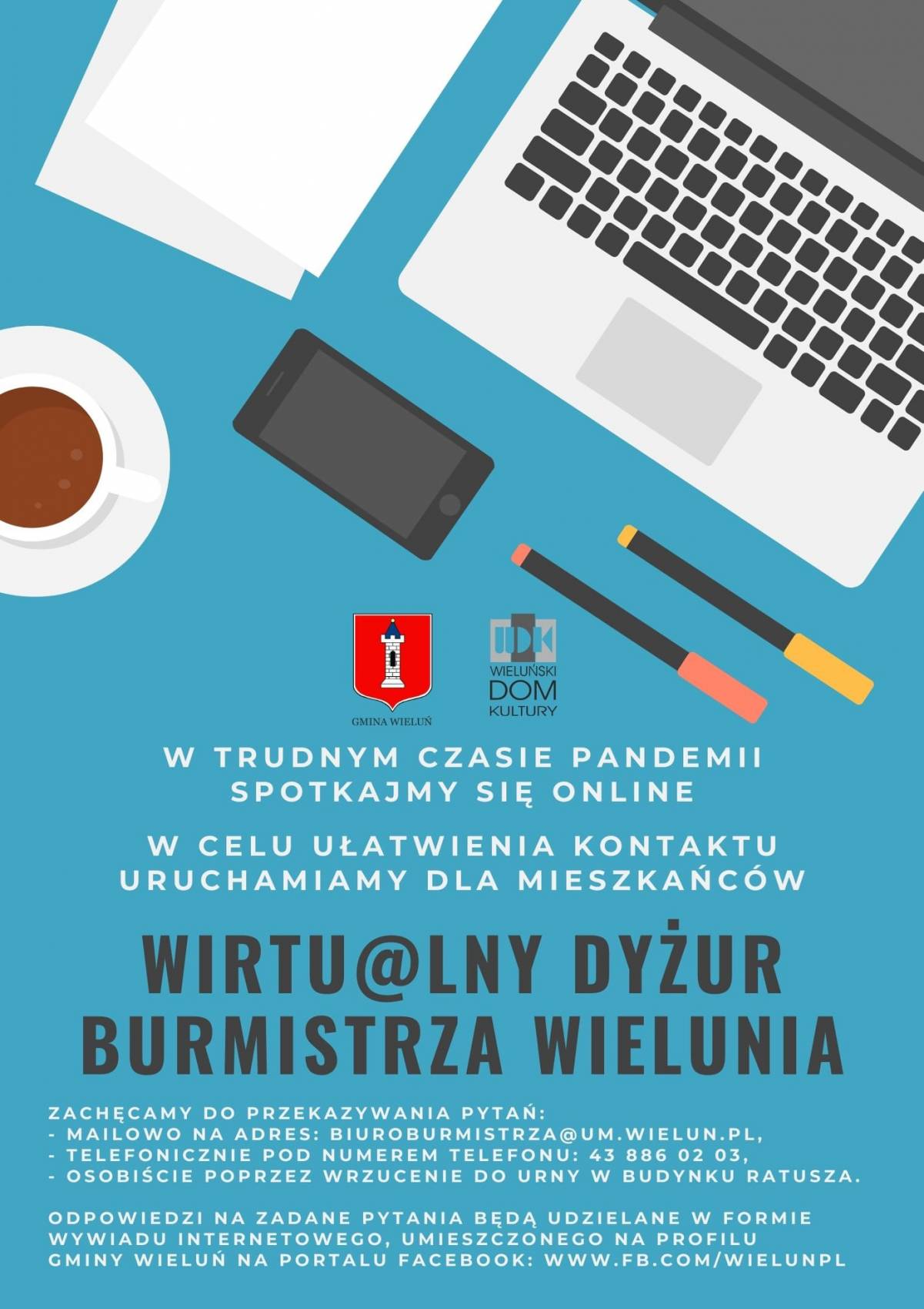 W związku z trwającymi obostrzeniami związanymi z sytuacją epidemiczną w kraju, wprowadzamy udogodnienia w kontakcie mieszkańców z Burmistrzem Wielunia, w sprawie zapytań, wniosków i skarg.