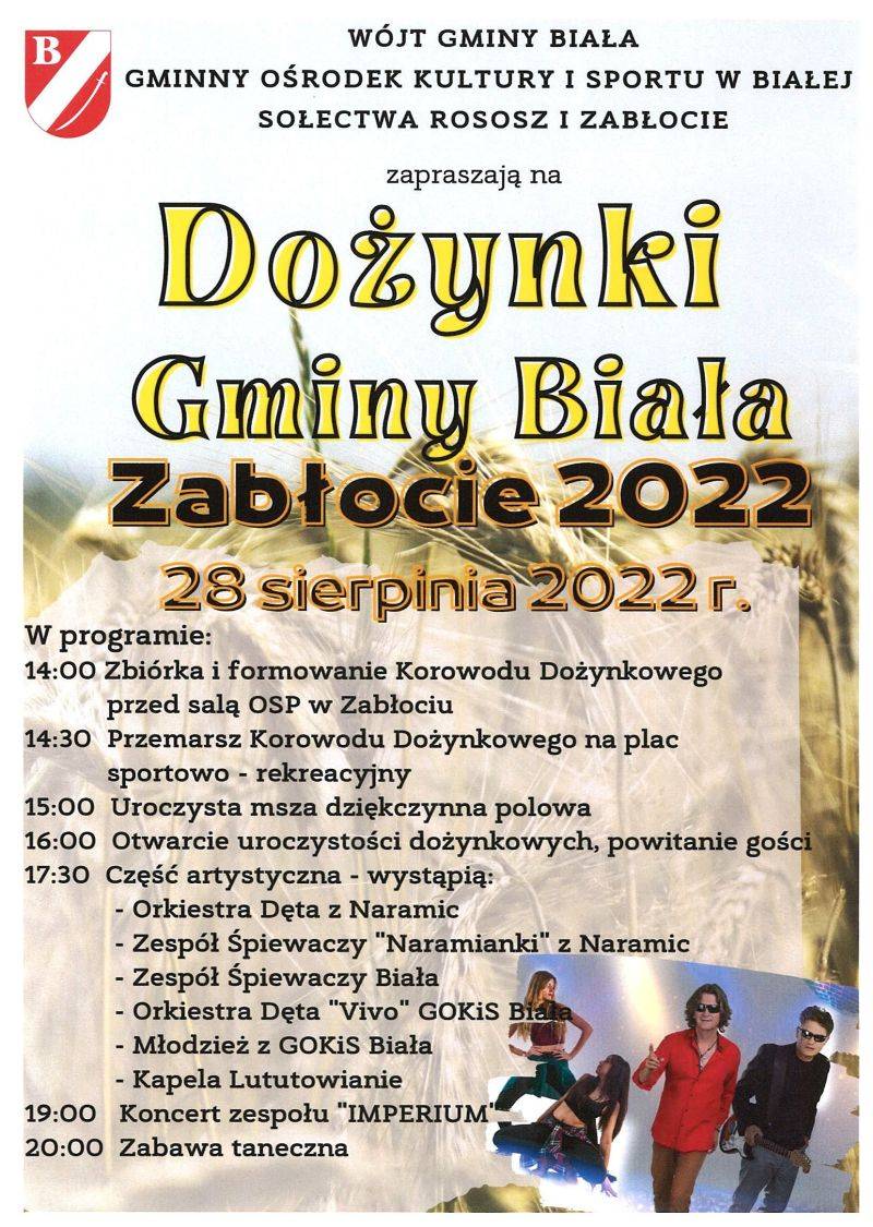 Wójt Gminy Biała, Gminny Ośrodek Kultury i Sportu w Białej oraz Sołectwa Rososz i Zabłocie zapraszają 28 sierpnia 2022 r. do Zabłocia na "Dożynki Gminy Biała - Zabłocie 2022". W programie wiele atrakcji.