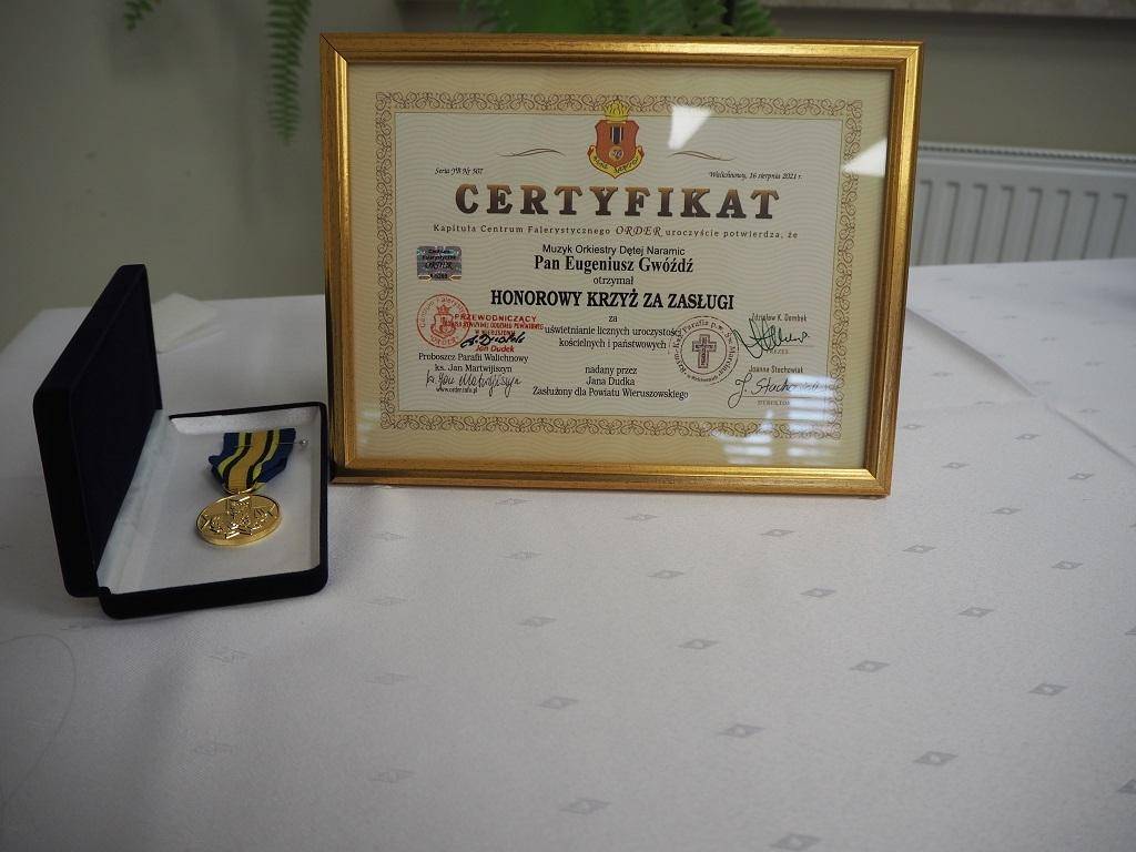 27 sierpnia 2021 r. w Gminnym Ośrodku Kultury i Sportu w Białej z inicjatywy Przewodniczącego Komisji Rewizyjnej Oddziału Powiatowego OSP w Wieruszowie Pana Jana Dudka, odbyła się uroczystość wręczenia Honorowego Krzyża za Zasługi muzykom Orkiestry Dętej z Naramic.