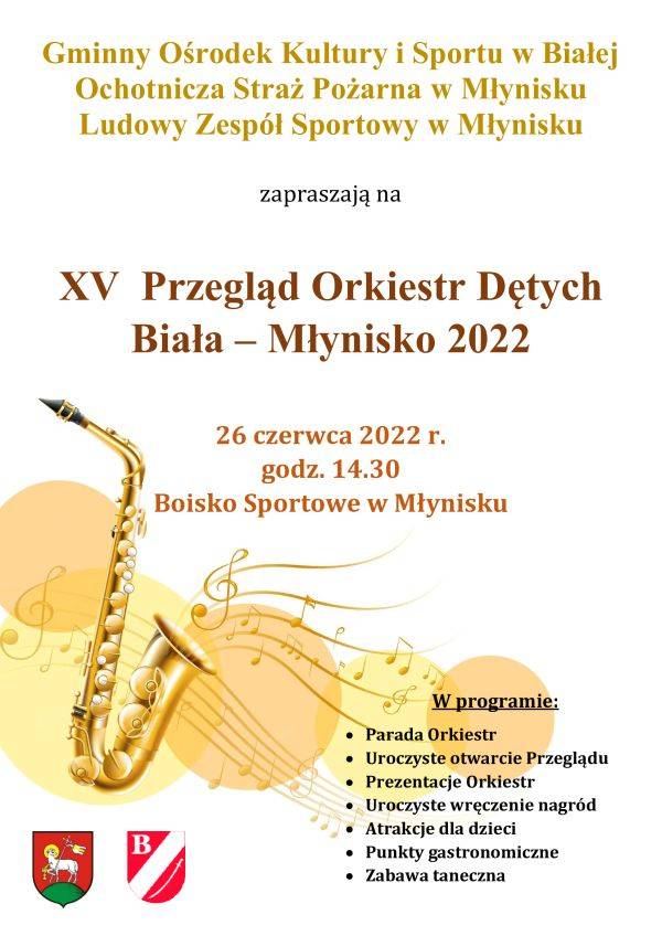 Gminny Ośrodek Kultury i Sportu w Białej oraz Ochotnicza Straż Pożarna i Ludowy Zespół Sportowy w Młynisku zapraszają 26 czerwca 2022r. wszystkich miłośników instrumentów i orkiestr dętych do miejscowości Młynisko.