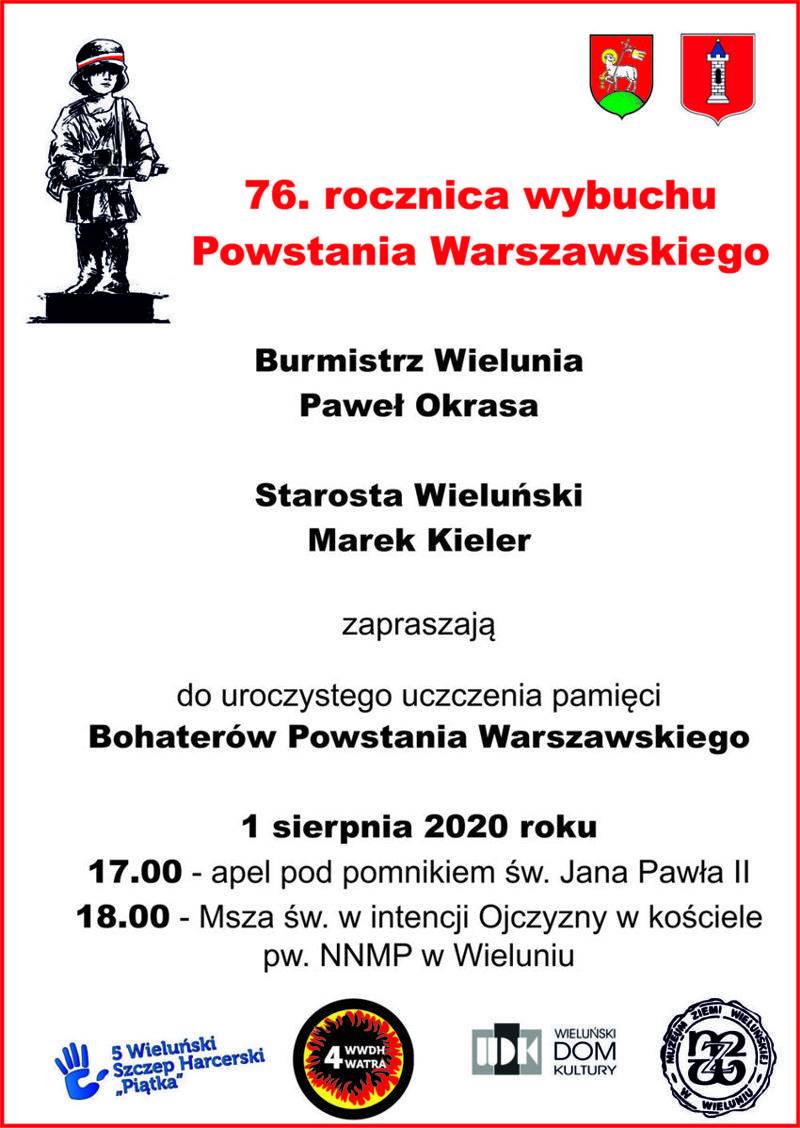 Burmistrz Wielunia Paweł Okrasa, Starosta Wieluński Marek Kieler zapraszają do uroczystego uczczenia pamięci Bohaterów Powstania Warszawskiego.