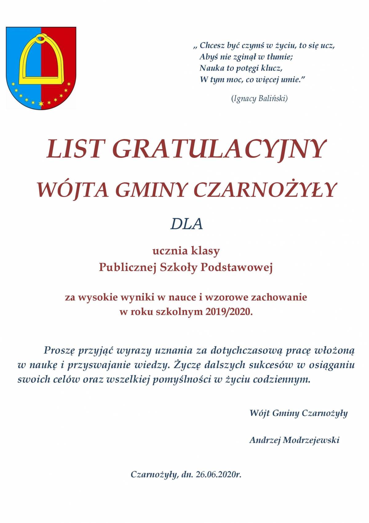 W związku z ograniczeniami sanitarnymi nie została zorganizowana uroczysta gala, postanowiono że podczas zakończenia roku szkolnego w dniu 26 czerwca 2020 r. stypendia zostaną wręczone w poszczególnych szkołach odrębnie. Wychowankowie osiągający wysokie wyniki w nauce otrzymali z rąk Wójta Gminy Czarnożyły - Andrzeja Modrzejewskiego oraz Sekretarza Gminy - Piotra Kędzi list gratulacyjny oraz pieniężne stypendium.
